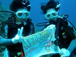 本日ラストは結婚1周年記念のラブラブご夫婦☆ぬまお&たむたむです!!2人は去年ダイビングをしていたので復習をしながら!!余裕で水中世界へ行くことができましたぁ♪まずはメインの青の洞窟へ!!人はいっぱいでしたが真っ暗の中に蒼くぽっかり浮かび上がっている光景はと〜っても綺麗でしたね!!陸上では1人で泳ぐことに抵抗していたものの・・・水中で聞いてみると元気良く「は〜い!!」って(^0^) 自由に泳ぎまわるのは楽しいし気持ちいいよね☆そしてサプライズ!!1周年記念のお祝い(^^) おめでとぉ♪♪これからも仲良しラブラブでいてくださいね〜!!ではお2人からコメントです☆ ぬまお☆サプライズ最高!!良い1周年を迎えることができました。また来年もお願いします。 たむたむ☆ダイビングは2回目だったのですが今回はお魚がたくさんいてすごく充実してました☆時間もたっぷりあって、また絶対やりたいです(^^) サプライズもすごく嬉しかったです(^0^) 喜んでいただけて良かったです♪また一緒に水中でお祝いしましょうね〜(^0^) 来年も沖縄の青い海でお待ちしてますよ〜♪ |