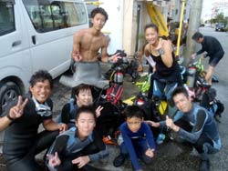 はいさーい!!久し振りに沖縄に帰ってきましたジュンでーす!!海日記を久し振りに書いちゃいますよ☆今日は、わたべさん率いるメンバー、ハージィ夫妻、ひーさん&すーさん、くまちゃん、ポンポコさん、遅刻してきた社会人にしおくん、船酔い大嫌いなナガピーと一緒に辺戸にいってきました☆台風さんが近くなる中、海も少しユラユラしていましたね!!1本目は辺戸ドームに!!水中にある洞窟を入って行くと奥の方ではドーム状の空気のある真っ暗な空間にたどり着きます★顔をあげてみんなで記念撮影!!コオロギもいたかな?!スーさん、コンタクトありがとうございました☆親子ごっこも久しぶりですね〜!!帰りは鍾乳石のようになってる岩を見たり、出口のところの青い光がキレイでしたね!!船酔いナガピーはちゃんと楽しめたんでしょうか??(笑) 2本目は海も荒れてきたので、近場のポイントへ!!すこし流れもありましたが、透明度もなかなかよかったですね!ウミウシを見たりしました!!今日は、日差しも強くて台風が近いとは思えないほどいい天気でした☆みなさんまた沖縄で潜りましょうね〜☆日焼けのしすぎには、僕みたくちゃんと気をつけてくださいね〜!! |