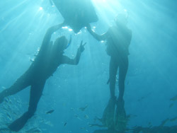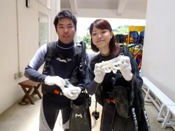 午前中にガッツリ2DIVEコースで参加してくれたのは2日前に結婚式を挙げたラブラブのお2人☆かずくん&のりちゃんです!!のりちゃんはライセンスを持っていて5年ぶりだったのでかずくんとゆっくり練習から♪でもすぐに勘を取り戻したみたいでフワフワ浮きながら泳ぐ感覚を楽しんでいましたね〜(0^^0) かずくんは初めてだったけどちょ〜余裕で水中世界へ!!ライセンスを取るのと同じような練習をして1人でスイスイ泳いでいました☆本当にめちゃめちゃ上手だったので次回はライセンス取得にぜひ!!挑戦してくださいね♪そして新婚お2人にはサプライズ!!水中で結婚おめでとぉ(0^^0) これからもず〜っと笑顔の素敵な2人でいてくださいね♪ではお2人からのコメントです!! かずくん☆魚がとても綺麗でした。ライセンスを取れるように頑張ります!!ありがとうございました。また遊びに来ます。 のりちゃん☆久しぶりで不安だったけど不安を忘れるくらい青色が綺麗でした。素敵なプレゼントもありがとうございました!!また来ます(0^^0) プレゼントも喜んでいただけて良かったです(^^) また南国の沖縄に遊びに来てくださいね〜♪ |