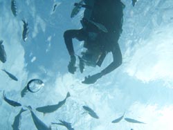 はーい!どーもーワンタンでーす!今日はケラマ諸島に体験ダイビングをしてきました!一緒に行ってくれたのは〜石川さん、楢本さんでーす!お2人ともダイビングが初めてという事で、石川さんはだいぶ緊張していましたね!水面で練習を続けながら〜無事に下まで潜ることができました!魚にエサをあげると〜わんさか寄って来ましたね((笑))。大きい魚のハマフエフキ!最後には〜泡のリング!その後はスノーケルでバブルリングを作ったり、素潜りしたり、カメも見ることが出来ましたね!!今日は天気も途中から晴れになってよかったですね!次回はビーチの体験ダイビングでも待ってますよ〜! |