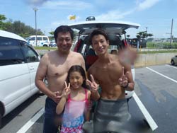 っちわ!!タクです。沖縄暑いです・・・。そんな今日、洞窟スノーケルに参加してくれたのは、小村さん親子です!!午前中にホテルのビーチで遊んできたとゆーことで、ライフジャケットの着方、フィンの履きかた、すんごいスムーズでした(笑)最初は歩いて洞窟へ♪奇跡的に洞窟の中は空いていました☆三人で青の光も見れて、エサあげもできましたね!お客さんから感想も頂いてます!! お母さん☆初めてのウェットスーツを着て、苦しくて行く前からどうしよう?! でしたが、水に入ると楽になり、景色のキレイさに苦しいのも忘れて、見入ってしまいました。ずっと行ってみたかった青の洞窟でしたが、行ってすごく良かったです。タクちゃんの一発芸も最高でした。ありがとうございました。少し酔ってしまいました・・・。 カオルちゃん☆初めての体験で最初は不安だったけど水の中を見たら、キレイな魚がたくさんいて感動しました!!青色の水もキレイだなと思いました。また泳ぎたいです。ありがとございました! お父さん☆最初は行くこともためらいましたが、行ってみたら想像以上に楽しかったです。ガイドさんの「タクちゃん」も、初心者とゆうことで丁寧に教えて頂き、感謝しています。また家族で来れたらいいなぁと思いました。ありがとうございました。 こちらこそ、ありがとうございました!!!俺自身も、色々見てて楽しかったです(笑)また来るときまでには、お母さんからの課題も勉強しておきます^0^またいらしてください。今日は、ありがとうございました!!! |