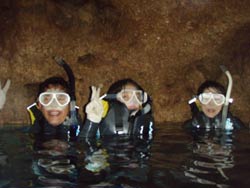 はいはーい!ども、りょーけんでっす。今日は体験ダイビングに行ってきました〜!今回のゲストはひかるちゃんとあきくん!!この2人と青の洞窟まで行ってきました〜。2人とも前日スノーケルをやっていたので最初の練習ではすぐに水中に潜ることが出来ましたね〜!周りを泳ぐ魚達を見ながらゆっくりと洞窟まで進むと、入り口でリュウキュウハタンポの子供達が魚のカーテンを作ってお出迎えしてくれましたね。奥のほうから振り返って真っ青に輝く入り口をゆっくりと観察しましたね!帰り道では魚に餌をあげたり、クマノミを見に行ったりして遊んでみました。帰る時には2人ともかなり上手に泳いでいて一人前のダイバーになれそうな感じでしたね!また沖縄に来る機会があったら次回も一緒に海に遊びに行きましょうね〜!! |