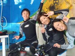 今日も快晴☆砂辺はと〜っても穏やかですよぉ(0^^0) そんな中、本日OWダイバーが誕生しましたぁ♪ゆみこさん&ジークです☆1日目と2日目は重森先生のもとで講習!!スキルも学科も非常に優秀!!なので今日はほとんどお遊びダイビングしてきましたぁ♪最後は先輩ダイバーすずちゃんと合流してスキルチェック!!レギュレーターリカバリー!!昨日からはずす練習をしていたすずちゃんが見本を見せてくれました♪ビックリするくらい上達が早いね(^0^) そして2人も見事リカバリー成功☆!!OWダイバー合格!!おめでとぉぉぉ☆★☆これからもたくさんのゲストさんといろんなポイントで潜ってくださいね♪ではお2人からのコメントです!! ジ―ク☆楽しく終了することができました〜 !!ダイビングを続けて行きたいと思い ます。 ゆみこさん☆海の苦手な私でしたが最後の チャレンジとしてダイビングをしてみまし た。やってみて良かったで〜す♪素敵な 世界に会えました!! 次回はボートでのんびりダイビングしましょうね〜(0^^0) |