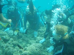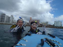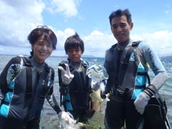 はいはーい!ども、りょーけんでっす。今日は体験ダイビングに行ってきました〜!今回のゲストは愛知県からお越しのこうちゃん&みさちゃんの仲良し姉弟!この2人と砂辺の海を満喫してきました〜。まず最初はダイビングへ!2人とも初めてのダイビングで最初は緊張して体が強張っていましたが、しばらくすると慣れてきたのかリラックスして泳いでいました!上がって休憩後はスノーケルへ。波も無かったので気持ちよかったですね!ナマコやヒトデで遊んだりして最後は魚に餌付けをして遊んだりしました!今回2人からコメントを頂いているので掲載します。 こうちゃん:初めてのダイビング体験でしたが、安心して楽しめました。手に持ったえさに魚達が集まってきて、とても感動的でした。 みさちゃん:ずっとしたかったスキューバーダイビングができて嬉しかった。魚が思ったより近くで見えすぎて怖かったけど、小さいきれいな魚の群れはすごくきれいだったし大好きなニモにも会えて嬉しかった。もっと魚に慣れて一人でもぐんぐん潜れるようになりたいな! 以上です!!また沖縄に来たらゆっくりと潜りましょうね!! |