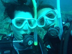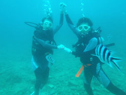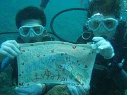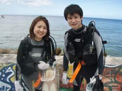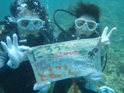 今日の体験ダイビングは新婚さんのお2人!みっきーとまゆゆです♪ダイビングは初挑戦で少し緊張があったようですが、水中に入ると2人とも余裕の「笑顔」でした!水中には沢山の魚がいて常に周りを泳いでくれていましたね!写真も沢山写して魚にえさをあげたりたっぷり遊べましたね☆お2人から感想を頂きました! みっきー:初めてのダイビングだったのですが、事前に息の仕方など親切に教えてくださったので安心して出来、海の中に入ってもとても楽しかったです。またやりたいです。 まゆゆ:初めてなのでとても不安でしたが、事前に練習をじっくりできるので、安心して水に入ってからは見たことない世界に夢中でした!!本当ーーーーーーに楽しかったです!! 水中での新婚祝いも楽しかったね♪また違う海でもダイビングしてみましょう!!また遊びにきてねーーーーー♪ |