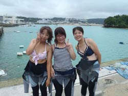 はいさ〜〜い、せーやです!!やっと台風抜けてくれましたね。今日はボートからのマエダ岬、青の洞窟シュノーケリングでした!一緒に泳いでくれたのは関西からお越しの女の子三人組み☆三人は学校の時の友達らしく保育園、幼稚園、小学生の先生という何ともおもしろい関係^^笑)そんな先生達も泳ぎは苦手らしく最初は緊張していましたが、入って海のお魚達を見た瞬間自分が話しかけても若干シカト気味でしたー♪台風後とは思えないくらいとてもキレイで洞窟の中も澄んでいましたね!!帰りにはお魚にエサもあげて、お魚の勢いと近さにびっくりしていましたね。今日の感想を皆にももらったのでのせていきたいと思います! イモちゃん「意外と時間が短く感じました。でもすっごくキレイで楽しかったです。今度はダイビングをやってみたいです!!」 マコちゃん「船に乗る前は泳げないので不安だったけど、海のキレイさに癒されて不安もなくなりました♪洞窟に着いたら今までに見たことがないぐらい海が青くてびっくりしました!魚の赤ちゃんがいっぱいいてちょっと気持ち悪かったけど感動しました。一発芸も面白かったですいい思い出になりました!!」 彩ちゃん「初めてのシュノーケリングで最初はとても緊張して不安でしたが、すぐに慣れてきてとても楽しかったです!!リラックスできました。海の色もとてもきれいで沖縄を満喫した感じです。あっという間に過ぎてました。次はダイビングもやってみたいです。ありがとうございました!!」 今日は天気は曇りだったけど、水中は雲一つない快晴だったからよかったね☆笑)またストレス溜まったらいつでも沖縄の海に癒されにきてくださいね!! |