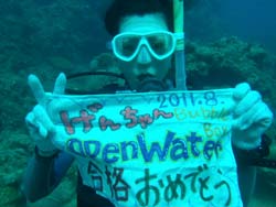 今日は新たなOWダイバーが誕生しましたぁ♪なんと嵐を呼ぶ女!!げんちゃん!!今回も台風から始まり・・・でも最終日は最高の晴れ!!プールから始まり奥武島での海洋・・・そしてようやく沖縄の青い海にご対面することが出来ましたぁ♪スキル事態に特に問題はないのですが・・・なにせかなりのビビり★笑 でも気合で!!乗り越えてきました(^0^) 最後は水面を見上げる程の余裕が出来たみたいでダイビングを楽しめるようになったかな♪苦手なマスククリアを試験で見事やり遂げ!!OW合格!!おめでとぉぉぉ☆これからも安全第一でたくさんの人とたくさんのポイントで楽しんでくださいね(0^^0) それではげんちゃんよりコメントです!! 到着初日は、せっかくの沖縄だと言うのに”雨”ではなく”台風”!!なんという事でしょう・・・。と、思っていましたが日が経つにつれ青空が見えてきました☆初めての器材、重さにビックリ!!なのに、インストラクターさんの女性たちは自分よりも小柄な人なのにひょいっと持ちその姿に感動しました(笑)学科は自分がおバカなせいでなかなか進みませんでしたが、担当のユーリさんが根気良く教えて下さったおかげで全てが終了♪キレイな海にも入れたし、今までに体験したことのない連続でした。皆さんも機会があれば海に潜るべきだ☆そしてバブルボックスの皆様。本当にありがとう!! |