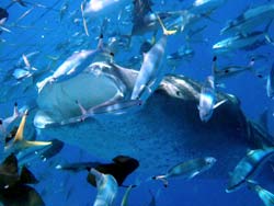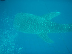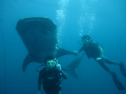 今日はジンベエザメに会いに行ってきましたよ~♪お昼に沖縄入りしたアッキー&ゆかりんです!!2人とも約1年ぶりのダイビングなので復習をしてからエントリー(0^^0) 3匹のジンベエとたっぷ~り遊んで来ましたぁ♪入ってすぐ目の前で餌をあげている時のジンベエはものすごい迫力でしたね(^0^) こっそりジンベエくんのサメ肌も感じてきちゃいました☆頭からだとスベスベお肌なのにシッポからだと・・・笑 他にもと~っても大きなツバメウオや美味しそうなグルクンなども大量に群れていて楽しかったですね~♪ちょっぴり流れがきつくて40分間泳ぎっぱなしでしたが(^^;) 明日のビーチはのんび~り楽しもうねぇ♪ |