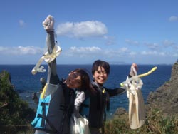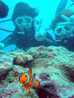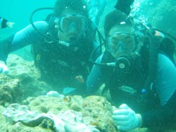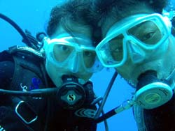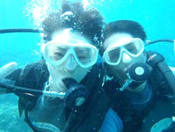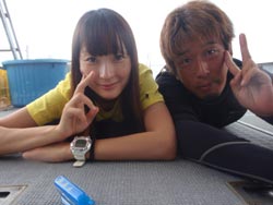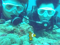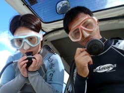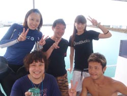 はいさい!今日は2年ぶりに遊びに来てくれた、リコとその彼氏のけんちゃんです。けんちゃん、イケメンです。りこは、ライセンスも持っているので説明をしている時や、練習中は、久々の再会にスタッフ達とぺちゃくちゃと、相変わらずおしゃべりでした。イケメンけんちゃんは、説明をしたあと、浅場で呼吸だけじゃなく、せっかくなので、泳ぎのコツを教え、いざ、深場へ、途中かなりの水中写真や水中ムービーをしっかりとりました。ニモとの写真もかなり何枚もとりましたが・・・けんちゃんはイケメンなんだけど・・・りこの顔が・・・こわい・・・何回とっても怖い・・・、その後水深ー12m体験ダイビングで一番深い水深まで行き、バブルリング大会や、透明のエビをみて、空飛ぶようにお花畑まで行きました。お花畑もとってもきれいで、けんちゃん!かなり、うまいよ。リコ負けちゃうんじゃない?ぜひぜひライセンスゲットで、ケラマに行こう~~!それにしても、久しぶりのお花畑にりこもけんちゃんも喜んでくれてよかったよ。夜はちょこっと、飲みすぎたけど、りこ!けんちゃんあんまりしからないでね。また、飲もうね。待ってるよ~~! |
