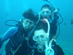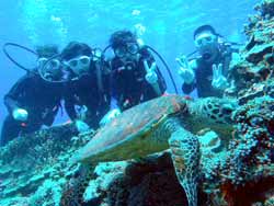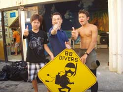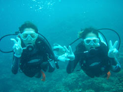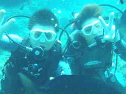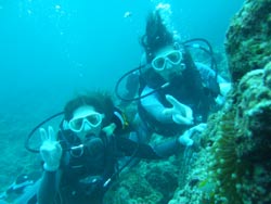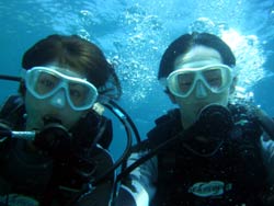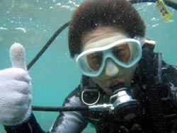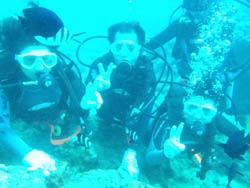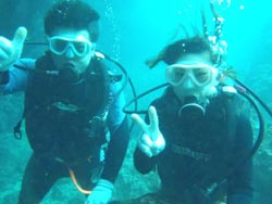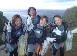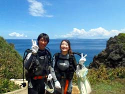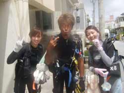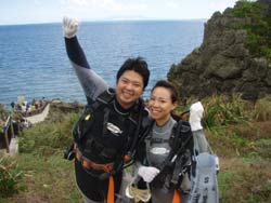 はーい!どーもワンタンでーす!今日は真栄田岬で体験ダイビング!!一緒に潜ってくれたのは~マサヒデさん!ゆみさんでーす!初めてのダイビングっということで・・・緊張でドキドキでしたね!でも練習してみるとー案外大丈夫でしょー!!耳抜きもできていたみたいだし!泳いでみると~魚が寄ってきたり~エサをあげたらだいぶ・・群がっていましたね!!今度こそは~青の洞窟体験ダイビングしてみましょうね!!いつでもお待ちしていますね!! |