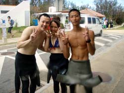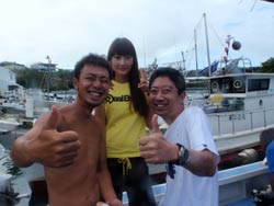 っちわ!タクです。今日は真栄田ワッショイ、砂辺ワッショイのお祭りパーティです(笑)そんな本日、スノーケルとダイビングのセットコースに参加してくれたのは、松本さん親子!!お父さんと息子さんでしたが、2人ともダイビングの経験有りで、スノーケルは楽勝♪帰りは波があって大変でしたが・・・(汗)お次のダイビングでは、もっと大変でしたね!^0^!でかい波がドッカ―ンと当たってました!!隙を見てさササッと出発。なんとか無事にニモに会いに行くことができました!でも2人とも上手だったので、最後は自分で泳げましたね!!バブルリングも見れたし☆ささ、2人からの感想です! お父さん☆ネットで調べて選んだ理由は初心者にも親切に教えてくれると評判でしたので選びました。まさに評判以上のアシストぶりでとても楽しくダイビングできました。帰ったら皆に宣伝します。 ヨウヘイ君☆最初は波が高くて不安だったけどめっちゃ楽しかったです。またダイビングしてみたです。色んな魚とか見れて思い出に残りました。 今日はありがとうございました!!最初はどうなるこかと思いましたが・・・(笑)でも一緒に潜れて良かったです!また沖縄でお会いしましょう!お待ちしてまーす☆ |