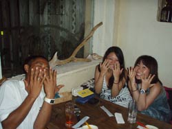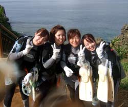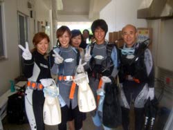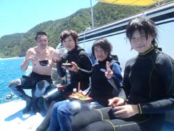 はいさ~~い、せーやです!!なんか雨雲が出てきた夕方前ーーー元気のいい4人組が遊びに来てくれました☆京都からお越しで小太郎さんと香菜さん・有希さん・侑恵さんの仲良し組み!!小太郎さん以外はみんなダイビング経験がありとっても海が大好きですね。小太郎さんは最初やっぱり緊張していましたが、海に入ったらまあ~~大変!!笑)一番ハッちゃけてました♪他のみんなもほんとに上手でけっこう潜りましたね。そんなみんなからコメントも頂いたのでのせていきまーす☆ 小太郎さん「沖縄初上陸!!ダイビング初体験!!親切で面白いインストラクターさんのおかげで思っていたより、泳げて最高でした!!調子に乗って今度は一人でダイビング目当てで来たいです!!」 有希さん(ゆーゆ)「2年ぶりのダイビングは最高に楽しかったです!お兄さんの説明も分かりやすく安心して楽しめました~~♪お兄さんも面白かったデス(笑)洞窟はとてもきれいで二回目でしたけど今回もきれい過ぎて感動しましたあああ☆また来たいデス(^v^)☆」 侑恵さん「めーっちゃ楽しかったです!!色んな魚やサンゴ、洞窟もすごくきれいで感動しました!!次、沖縄に来たときも、、絶対絶対ダイビングします!!とっても親切に教えていただいてありがとうございました!!」 香奈さん「今日はとても楽しかったです☆丁寧に説明していただいたのでとても分かりやすく、2年ぶりのダイビングでキンチョーしてたけど、安心して潜ることができました。おもしろいインストラクターの方たちで楽しく魚もたくさんいてイイ思い出になりました。また沖縄に来ることがあったらぜひまたよろしくお願いします。ありがとうございました☆」 みんな~~たくさんのコメントあざーす!また絶対遊びに来てね♪小太郎さんはぜひライセンスも!笑) |