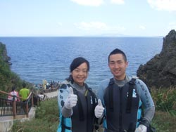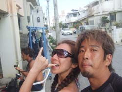 はいはーい!ども、りょーけんでっす。今日は体験ダイビングに行ってきました~!今回のゲストは愛知県からやってきたやすくんとあゆみちゃん!この2人と真栄田の海に遊びに行ってきました!まず最初はダイビング!2人とも経験ありでしたが、かなり昔だったためちょっと緊張していましたね。水中では次第に勘を取り戻してかなり上手に泳いでいました。クマノミに会いに行ったり、魚に餌付けをしたりして遊んでみました。その後ゆっくりと上がって休憩を取った後はスノーケルへ!! っちわ!タクです。続いてスノーケルへ行ってきました!!!ダイビングの後とゆーことで、楽勝楽勝♪でも最初は歩いて洞窟へ。鍾乳洞探検のような感じで進んで、洞窟の中から出発しました☆いっぱい人がいましたが、最後は早く見たい気持ちを抑えて・・・、よく俺の「じらし」に耐えてくれました(笑)帰り道は波がありましたが、無事に帰ってこれました(汗)そんなアスレチックな気分を満喫したお2人から感想を頂いてます! やすくん&あゆみちゃん☆ダイビングもシュノーケルもめちゃくちゃ楽しかった。海ガメとマンタが見れなくて残念(笑)沖縄の海は思ったより綺麗で気持ちよかった。また来たいです!! |