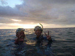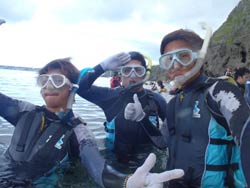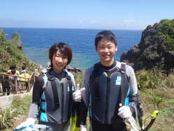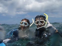 みかさん☆今日は天気も良く海も最高に綺麗でした!!イントラのルイージさんが最初から和ませて下さり、泳いでいる最中も飽きることなく楽しませて頂きました♪初の沖縄旅行がお陰様で楽しい思い出となりました!!また次回はダイビングで参加させて頂きたいと思います。ありがとうございました!! せいごさん☆初めてのシュノーケル最高だった!!魚にえさあげ青色に輝く洞窟も何もかもが感動☆最後のルイージさんの一発芸もすごかったです!!またぜひやりたいです!!ありがとうございました!! |