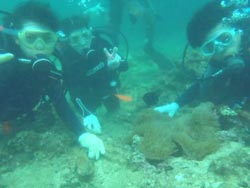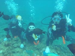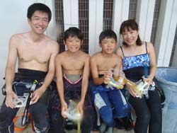 っちわ!!タクです。今日は飛び入り参加で、佐藤さん家族が遊びに来てくれました☆ポイントは砂辺!皆さん初めてとゆーことでしたが、練習のときからお母さんド緊張(笑)お父さんはライセンスをもってるかのような落ち着きぶり!水中でも案の定上手でした^0^リオちゃんも上手だったね。ニモの家族にも会えたし、1発芸も見れたね!お母さん大喜び(笑)でも皆で潜れて良かったです!!!最後に皆から感想ももらいました! お母さん☆最初、緊張してうまく出来なかったのですが、いつも温かく教えてくださって無事にダイビングを楽しむことができました。クマノミの家族、タクちゃんの1発芸、感動です!!すぐ近くでお魚たちが泳いでるのも、またとない体験でした。初めてのダイビングでしたが、シゲちゃんとタクちゃんのおかげでいいダイビングになりました。ありがとうございました。 お父さん☆生まれて初めてのダイビングでした。とても楽しかったです。やはり感動です。挑戦してみて本当~~~に良かったです。親切にして対応していただいたスタッフの皆さん心から感謝します。ありがとうございました! リオちゃん☆楽しかったです。(クマノミを見たときと、バブルリングを見たとき)またやりたいです。(ここで) 今日はありがとうございました!また沖縄来た時は遊びにきてくさいね。お待ちしてます! |