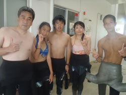 はーい!どーもーワンタンでーす!今日は~15時から体験ダイビングしにきてくれたのは~二瓶さん!りえちゃんでーす!!二瓶さんはライセンスをもっていて一年振りということで参加((笑))。理恵ちゃんは初めてのダイビングでドキドキしながら((笑))。でもでも皆無事に潜ることができましたね!海には色んな生物がいて面白いですよね!!次回も必ずチャレンジしてみてくださいね!! |