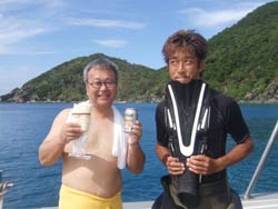 はいさい!今日はマンツーでじゅんちゃんとビーチファンダイブです。なんと今日3本潜るとじゅんちゃん祝300本ですが、スーパーディープ予定なので、どうやって3本潜るか検討、まずは、まずは、-00mへアケボノハゼを探しに行きました。居ました居ました。4固体です。もちろんじっくり見ることは出来ませんが、その後安全停止で大物待ち・・・・流れが少し出始めたりカスミチョウチョウウオやアカモンガラ、いわしの群れなどが出始めましたが・・・マグロは出ず・・・2本目は、深さを気をつけながら、海ウチワを探す事5分!なんとー20mでピグミーシーホース2固体発見!この深度なら、じっくりカメラを向けて写真を撮るのが楽しめる深さです。残念ながらじゅんちゃんはカメラをしないので、2人でかなり長い間、眺めていました。3本目は、悩みに悩んであまり深いところに行かない条件付で・・・・潜りました。地形を眺める上からのダイビングですが、結構楽しめました。流れが無く大物の出る気配は、ありませんでしたが、十分楽しく、意外と透明度もよかったです。そして2人で300本を水中でお祝いです。他にもダイバーが居ればよかったんだけど・・・記念撮影をしたあと、焼き肉です。ってそこで解ったのだ なんと!!じゅんちゃん今日が誕生日だったとか・・・!!早く言ってよ~~慶良間ファンチームのやすねーしんくん、担当リョウケンそしてなぜかいつも遊びに来ているシーサーと6人でおめでとう焼き肉!それも半額で!!そして、かなり体に窒素をためてしまった。久々のスペシャルディープダイブでした。たまには、いいよね。こんなのも!!! |
