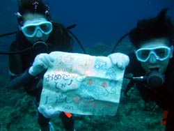 今日は真栄田岬で体験ダイビング!参加してくれたのは、結婚4年目のたーくんとりえちゃん!真栄田岬であえて洞窟をスルーして潜ってきました!りえちゃんは始めチョッとドキドキしてたようですが、少し練習をするとスムーズに潜ってくれました☆水中には可愛いクマノミや小さな毛だらけのカニや綺麗な魚が泳いでました!最後には結婚記念日のお2人にサプライズのお祝いも♪これからも仲良くお幸せにね! お2人から感想も頂きました! たーくん:初めてのダイビングでしたが、とっても楽しかったです!!良い結婚記念日になりました。またよろしくお願いしまーーーす!! りえちゃん:今日は海に入れるまで時間がかかってしまったのにとても優しくアドバイスをしてくれてありがとうございます!!安心出来てとても楽しいダイビングになりました♪完全にはまりましたよ!!結婚生活も又楽しくなりそうです。良い想い出です!!担当して下さった方がシゲちゃんで良かったです。また宜しくお願いします。 こちらこそ!!!また遊びにきてねーーー♪ |