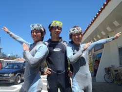 今日はなんと★幼稚園からのお友達と言う男3人組みゆうくん&しょうくん&あっきーが体験ダイビングをしに遊びに来てくれましたぁ♪ゆうくん以外は1度ダイビング経験有り!!なのでゆうくんに合わせてのんび~り行ってきました!!でもそんな心配もいらず3人ともかなりスムーズに水中世界へ!!洞窟まで一気に泳いで行きましたぁ♪洞窟内はなんと貸切!!しかも今日はかなり綺麗☆たっぷ~り眺めて癒されてきました(0^^0) そして外洋に出てからは自分たちでいっぱい泳ぎ回りました!!自由に泳ぎまわるのはとっても気持ちいいでしょ~♪それでは3人からのコメントです!! ゆうくん☆とっても綺麗な海が見れて感動しました!!イントラの方も楽しませてくれました♪また来たいです!! しょうくん☆海の中は東京の100倍キレイだった!!沖縄最高~!!また来たい!! あっきー☆海の中はとても綺麗で感動しました!!こんなに魚に囲まれたのは初めてだしエサをあげたのも楽しかったです♪また来たいです!! ぜひまた沖縄来た時は遊びに来てね~♪次回はもう少しテンションあげて~!!