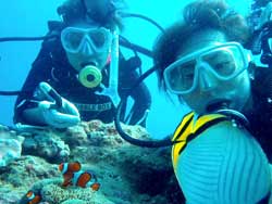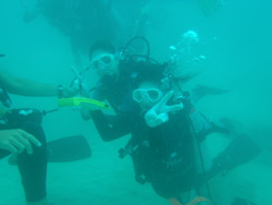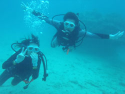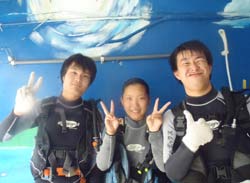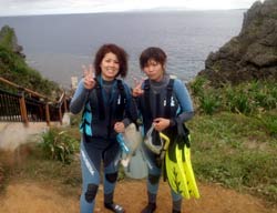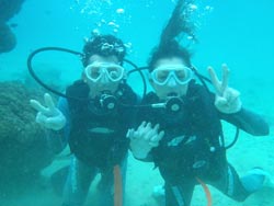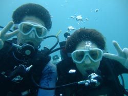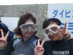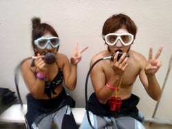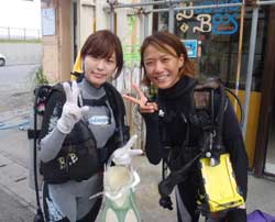 こんにちはーー!なすびです☆今日は砂辺で体験ダイビング〜♪遊びに来てくれたのはまこっちゃん&よっちゃーーん!!まこっちゃんは二回目の体験ダイビングと言う事ですっごくじょうずでした★よっちゃんは初めてだったので少し緊張気味でしたがニモにも会いに行けたしとても上手でしたよ――♪また2人で遊びに来て下さいネ―☆ よっちゃん[今回初めてのダイビングで、しかも全く泳げないので緊張と心配でいっぱいでしたが、インストラクターのお姉さんがとても優しく親切で丁寧に教えてくれたので良かったです!ニモには感動でした☆ありがとうございました♪] |