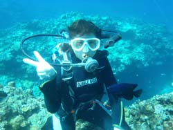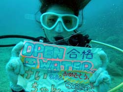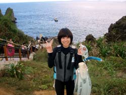 11:00体験☆Wコースに参加してくれたのは、春生まれのなつみちゃんです。とってもスマイルが可愛い女の子でしたが、根性と気合はありました。今回一人旅で、洞窟シュノーケルと、洞窟体験ダイビングにWで挑戦です。スノーケルもダイビングもマンツーマンだったので、とっても安心して、のんびりできました。クマノミにあったり顔より大きなツバメウオにあったり、餌付けの時は、びっくりしていましたが、写真もいっぱい撮りました。最後は自分で泳いでスイスイと魚をおいかけてみるなど、かなりかなり余裕で上手かったですよ。全然大丈夫だから、次回はダイビングライセンスに挑戦してみてくださいね。今回は、青の洞窟下からも上からもみたけど、きっと魚に囲まれている時が一番いい顔していたような気がします。春生まれのなっちゃん、絶対絶対また遊びに来て下さいね。その時は、体験ダイビングした春生まれのなつみですで、ばっちり思いだすからね!(笑)待ってます。無事にバスで帰れたのかな? |