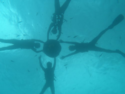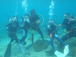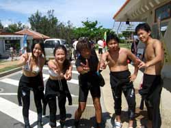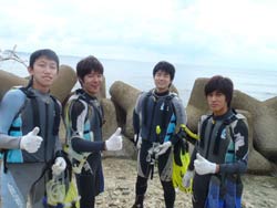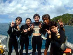 突然、飛び込みで遊びに来てくれたのは、中国は上海から遊びに来てくれた。愉快な仲間4人組、とっても可愛い日本語の上手なあかねちゃん、笑った顔がキュートな、フィオナ、一番元気で、愉快なまーくんそして泳ぎが苦手なリー君です。8:00から体験と洞窟シュノーケルのセットコースです。まずは、お花畑ポイントでダイビングです。緊張気味のリー君がんばりました。ゆっくりと練習して、浅瀬でもゆっくり練習、そして見事4人全員で潜ることが出来ました。サンゴをさわったり餌付けでは、顔が隠れるぐらいの魚が寄ってきたことに、かなり興奮していたようです。ニモに挨拶をして水中写真もかなり撮りました。ムービーではみんなの元気な姿を撮影です。かなりはしゃいでいて、こっちも楽しくなるぐらいです。みんなで潜れてよかったね!!洞窟スノーケルでは、青の光に感動して、自分たちでもスイスイと泳ぎ、なんだかなごり惜しそうにしていましたね。夜は防波堤でわざわざビールを買い込んでくれお礼までしてくれて、ありがとうね。いつでもまた遊びに来てよ〜〜まってるからね!俺の片言の英語でゴメンネ。そんな国際交流な日でした。 |