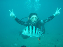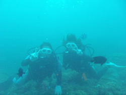 はーい!どーもーワンタンでーす!今日は砂辺で体験ダイビング!!一緒に潜ってくれたのは〜小杉のケンさん!ともさんでーす!けんさんはベテランダイバーさん!初めてなのは〜ともさん!最初は緊張でドキドキでしたが・・・潜ってる間に緊張もとけ、魚や風景を楽しんでいたご様子☆★ニモにもちゃんとあえて良かったですねー!!次回はライセンスにでも挑戦してみてくださいね♪ |