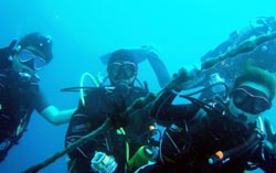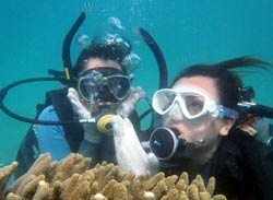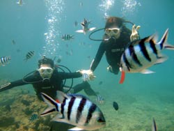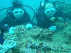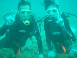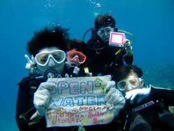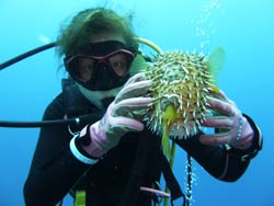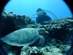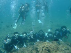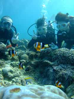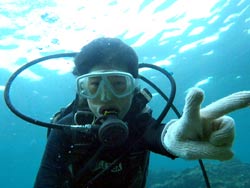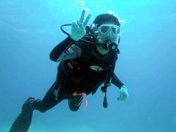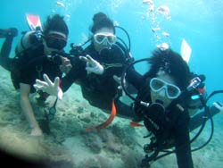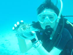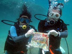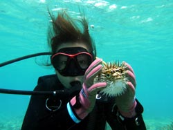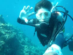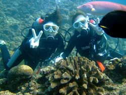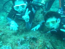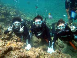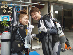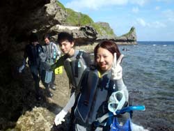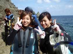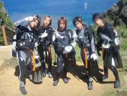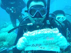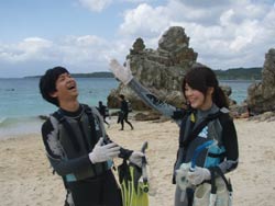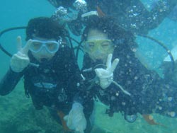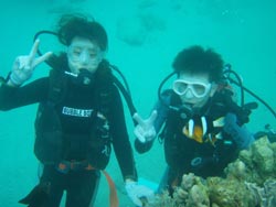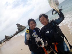 っちわ!タクです。本日飛び込みで、体験ダイビングに参加してくれたのは、ミルク&サーモン・・・。ユニークなあだ名です(笑)サーモンは俺とタメ!でもビックリしてたね^0^サーモンは海外でも経験していて全然余裕♪ミルクは初めてで、最初笑いながら緊張してましたが、余裕で潜ってるサーモンを見て、「私にもできる!」っと思ったのか急に上手になりました(笑)水中ではとにかく2人とも上手で、いい感じのズッコケ振りでしたよ^0^最後に感想を載せまーす。 サーモン☆二回目の沖縄ダイビング!青の洞窟に行けなかったのは残念だけど、親切なレクチャーやスタッフのキャラ」のおかげで体験したことのある自分でも十分楽しかった!ここにして良かったと思う!タクちゃんサイコー!また来ます^0^! ミルク☆初めてのダイビングIN沖縄♪ダイビング初めてだったからとっても緊張してたけど、一個下のお兄さんがとっても優しく教えてくれました^0^海の中でとまどってもお兄さんが落ちついて処理してくれて、とっても楽しいダイビングになりました!!また来たときもお兄さんに頼みたいです☆そのときも海坊主に会わせて下さい(笑) 次回はライセンス講習で海坊主に会いにきてくださいね(爆)待ってまーす♪♪ |