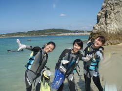 はいさ〜〜い、せーやです!今日も連日大盛況なゴリラチョップに行ってきましたよ。今日の朝はホントに天気が良く海況も昨日に比べてとても良くなりました♪今日一緒にシュノーケルをやってくれたのは、卒業旅行で沖縄に遊びに来てくれた女の子三人組みです☆みんな「中」の漢字が入ってるので、ナカーズというなんとも呼びづらいチーム名ですが、みんな元気よく泳ぎ最後にはばてました^^本当は昨日泳ぐ予定でしたが、一人風邪ということで一度中止にして次の日リベンジで今日にいたる。笑)でも、風邪も少し良くなって海況も天気もいいのでほんと移してよかったですね!! 由季さん「キレイな海とかわいらしいお魚がたくさん見られてすごく楽しかったです。聖也さんもすごく優しくて楽しくって安心してシュノーケルを楽しめました。ありがとうございました。今度台風のないときに来て青の洞窟に行きたいです。その時はよろしくお願いします!」 夏季さん「シュノーケルでどれぐらいサンゴが見られるのか少し不安でした。台風が来ていてシュノーケル自体できるかも分からず心配でしたが、日程をずらしてくださったり電話で丁寧に案内してくださって安心して当日を迎えられました。せーやさんはとてもおもしろく優しく教えてくれたので3人共楽しく安全にできました。今度来た時は青の洞窟をぜひチャレンジしたいです!!!」 英里さん「女3人卒業旅行で参加しました。風邪のため1日延期しましたが、逆に波も穏やかになり海の青さが予定日よりもますますきれいになってよかったです。実際潜って海水が入ったり呼吸の仕方が難しく大変でした。ダイバーのせいやさんが優しくて、そして時に厳しく(笑)丁寧に教えていただき、そして4人で一緒にたくさんの出来事を体験することができホントに楽しかったです!!」 |