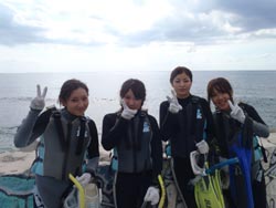 はーいはい!ども、りょーけんでっす。今日の午後からも体験は続きますよ〜!今回のゲストは兵庫からやってきたゆっきー&まっきー!この2人と真栄田の海で遊んできました!2人とも初めてのダイビングでしたが、陸上と水面でじっくりと練習をしたらリラックスして潜れてましたね。水中ではクマノミを見に行ったり、魚に餌付けをして遊んだりしました!最後にやった一発芸のバブルリングは2人とも真剣に見続けていましたね!ダイビングで楽しんだ後はスノーケルへ!スノーケルではまったり泳いで青の洞窟に行って来ました。距離があり途中疲れて休憩しましたが、青の洞窟まで辿り着けましたよ〜〜!そんな2人からコメントもいただけました。 由希子さん「関西から 初沖縄でダイビング&シュノーケルめっちゃおもろかった!!!ダイビングは初でハマリそう☆今日は今からハシゴでビーチにありがとうございました。」 真理子さん「姫路の海でゎ考えられんくらい嫌いでした☆ 初ダイビング&シュノーケルでしたが、めっちゃ気に入りました。がんばって次ゎライセンス取って来たいです。今日ゎありがとうございました 沖縄サイコーやん☆☆」 |