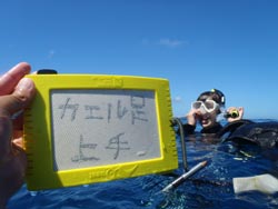 っちわ!タクです。続いて11時からは、バブルボックスでライセンスを取ったヨッシーと、その彼氏のニッシー!2人とも自分のマスクとグローブ持参とゆ〜、やる気満々での参加です(笑)そんな2人はやっぱり海の中でもFUNダイビングのように、ほどんど手助けもいらないほどでした^0^余裕そうだったので、海坊主も呼んで挨拶しときました(笑)感想ももらってます。 ヨッシー☆二年ぶりのダイビングでした。波がなくなって良かったです。タクちゃんのおかげで海のお友達にも会えて楽しかったです。 ニッシー☆初のダイビング。とても楽しかったです。うまく泳げなかったけど、海はとてもキレイで魚もいっぱい!タクちゃん、お友達によろしくお伝えください。また来ようー。 海坊主も喜んでます(笑)また会いにきてくださいね〜〜。待ってまーす♪ |