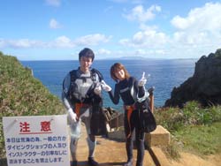 はいさ〜〜い,せーやです!!今日はやっぱりゴリラチョップだあ〜〜〜。一緒に潜ってくれたのは、北海道からお越しの色白カップル☆今回2人はダイビング初めてで緊張していると思いきやむしろ楽しみが多くてやる気満々でした!海に入るときはちょっと緊張していましたが、顔浸けてしばらくするとすぐ安心したのか楽しいっと笑顔MAX♪今日は魚も多くエサをあげるときもすごい勢いでご飯を食べにきましたね。クマノミも見に行き、あの名物も見て帰りました^^そんな2人から初ダイビングのコメントをいただきました! 竹村さん☆初めてのダイビング。楽しんでできることができました。魚のエサやりで魚がたくさんよってきたのが楽しかったです。本当に楽しくできました。ありがとうございました。 ユカちゃん☆初めてのダイビングで最高に楽しかった。耳抜きは大変だったけど、魚が本当に近くで見られてとても良かった。感動した!!丁寧な教え方で良かった。今度また来てダイビングしたい♪今度は一人で自由に泳ぎたい!! |
