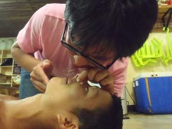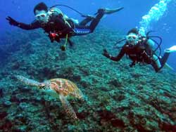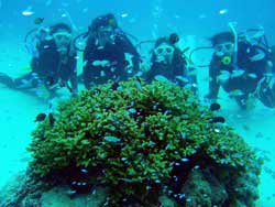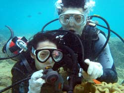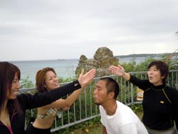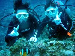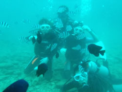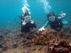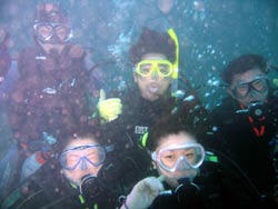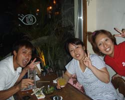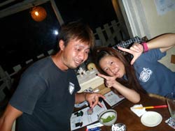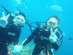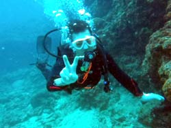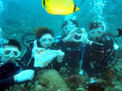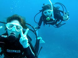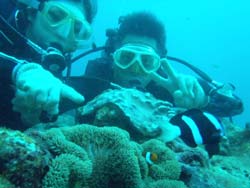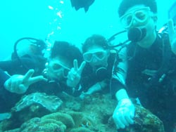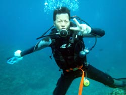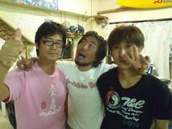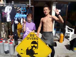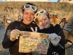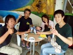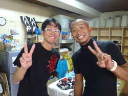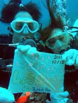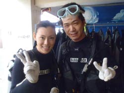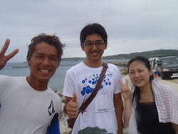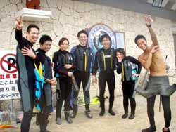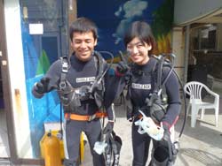 はいさ〜〜い、せーやです!!台風が下のほうにあるので風がぴゅーぴゅー吹いていましたね。そんな中一緒にダイビングしてくれたのは、東京からお越しの福田さん夫婦と、同じ東京からお越しの中国人の李さん兄弟の4人組み☆福田さんは2人ともダイビングのライセンスをお持ちで年に1,2回程度潜るみたいで、李さん兄弟は今回初ダイビングです!李さんのお兄さんの方は日本語が分かるのですが、弟さんは分からないので片言の英語とジェスチャーで潜っていきましたね!でも水中は何にでも興味があり、とっても上手でした☆そんなみんなから今回の感想をいただけました。 豊樹さん「ダイビングの説明やガイドがとても親切で楽しかったです。今度は体験ダイビングでなくファンダイブしたいと思います。ありがとうございました。」 香代さん「今日は波が高いとのことで心配したんですが、とっても楽しく潜ることができました。中国からの友達も大喜びで大満足でした!次はもっと深く潜りたいです。」 李さん兄弟「海がきれい!!!」 |