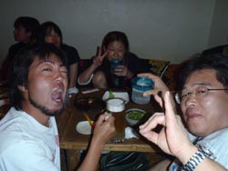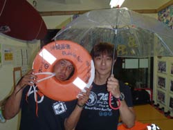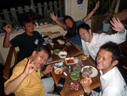 はいはい、ともです。今日は午後から到着された方のファンダイブ担当です。メンバーは女1人旅3度目のこばちゃんといつも元気なオヤジかせさんです。昨日も久々にUFOに行って、カマスの群れなど凄かったので本日1本目はUFOポイントに行ってきました。意外と透明度もよく、1つの人工物と二つ目の未確認飛行物体を見て着ました。相変わらずかせさんは、深場には立ち寄らず・・・遠くからUFOを、今回初UFOのこばちゃんは、一緒に撮影会をしたり、かなり色々と、UFOのまわりについた魚をさがしていました。二本目はお花畑に戻り、雨の中ダイビングです。透明度はそこそこよかったんだけど、海の中は光りがなくくらーい感じで・・・でもでも透明な海老や、かなり大きめのオランウータンなどなどこばちんは、かなり一生懸命カメラで被写体探しをして撮っていましたが。なんだか尻尾しか写っていない魚を撮ったり・・・ぶれていたり楽しいダイビングになりました・・・そして、そのまま夜の飲み会へ・・・・やっぱり2人とも飲むの好きだね〜〜海の中より飲み会が好きなかせさんでした。笑 |