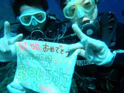 はいさ〜〜い、せーやです!今日は青の洞窟希望の方が遊びに来てくれたんですが、残念ながら今日は海況判断したところ行けずお店の目の前の海で潜ってきました!一緒に泳いでくれたのは、静岡県からお越しの新婚旅行の2人で〜〜す☆大志さんは初ダイビングで千枝さんはハワイで一回潜っているんですが、耳抜きに手こずってあまり楽しめなかったという事で今日はがっつり泳げるように陸でしっかり説明しました。そしたら最後少してこずりましたが、ニモがいるところまでスイスイ泳いで行けましたね!そんな2人から今日のコメントをいただけました☆ 大志さん「初めてのダイビングでしたが、楽しく出来てよかったです。新婚旅行で来たんですが、プレゼントで旗をもらいとても感激しました。今回体験してみてよかったなあ〜〜って思いました。いい思い出ができた!!」 千枝さん「耳抜きが心配だったけど一回目より余裕があったかも!?魚達にたくさん出会えたし、ニモに軍手の先を食われたし^^サンゴめっちゃやわらかくてこんな体験めったにできないし。。。結婚記念ということでインストラクターの方がサプライズプレゼントを水中でくれたんです!!!ビックリーー!!ありがとう☆貴重な記念になりました☆!!」 |