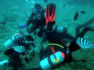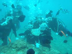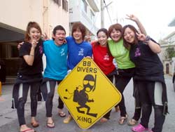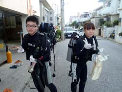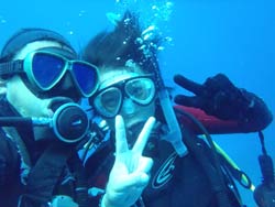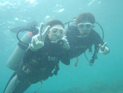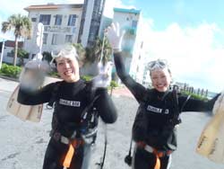 はーい!どーもーワンタンでーす!今日は〜砂辺でビーチ体験ダイビング☆★一緒に潜ってくれたのは〜兵庫からきてくれたカオリちゃん、アサミちゃんでーす♪ドキドキもしないで・・「たのしぃー!」っといって潜っていましたね(笑)。お2人ともお上手で一人でずーっと泳ぎきることができました!次回はライセンスにもチャレンジして下さいね★ |