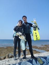 はいさ〜〜い、せーやです!!今日はええお天気でダイビング日和でございます!そんな中沖縄に新婚旅行っぽい感じで遊びにきてくれたカップルの2人が来てくれました☆帰ったら籍を入れるみたいでまだギリカップルですね。ななちゃんの方から今回の旅行とダイビングを企画したみたいで、ふっくんはちょっと緊張気味♪陸上でたっぷり練習し浅瀬でもたくさん練習していざ海へ!っと思ったらななちゃん酔ってしまい少しお魚見てゆっくり帰りましたね。そんな2人からコメントを頂きました。 ふっくん「潜りはじめは緊張していましたが、泳ぐ魚達をみているうちに楽しくなってきました。また来たいです!!」 ななちゃん「初めてのダイビングでしたが最初は緊張したけど、兄さんの優しい指導と、練習で大丈夫でした。気持ち悪くなっちゃってあんまり深くまでいかなかったけどかわいい魚も見れてよかったです!☆」 |