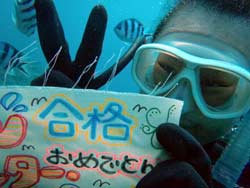 you...!! Next time please comeingKanazawa. 樹理(たく姉)・インストラクターになった弟を見に来ました。お客と言うよりも、「あぁ大きくなったなぁ・・・」と、しみじみお姉気分で見ていました。私にとっては非日常の水中が、タクにとっては日常で、そんな世界をのぞけたことが嬉しかったです。いい人たちに囲まれて、いい顔してました(^^)よかった…ありがとうございました。ふつつかな弟を、どうかこれからも宜しくお願いします。 |