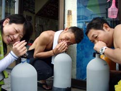 こんにちわ〜Jackです☆今日は竹内さんFamilyと砂辺で体験ダイビング^^♪お父さんは2年前にバブルでOWを取っていて2年ぶりのダイビング!!にも関わらず余裕でしたぁ!!お母さんと瑞穂ちゃんは最初は心配してましたが、途中で一人で泳ぐ事ができましたネ☆最初はバランスとるのが大変だったけど慣れてきたら自分でバランスも取れるようになって、初めてにしては、メチャメチャ上手でした!!魚にエサあげて、ニモ見て、サンゴのお花畑行って、お母さんと瑞穂ちゃんナマコの感触に最初はビックリしてましたね(笑)お父さんは終始2人を心配そうに見守っていましたぁ!!4人からのコメントを載せたいと思いまーす お父さん:念願の家族ダイブ。とっても楽しかった。今度はライセンスを取って3人でまた潜りたいです。 お母さん:初めは心配だったけれど大丈夫だった!!海の中はきれいで、お魚がたくさんいてステキでした。またやりたいなー。 瑞穂:人生初のダイビング、ドキドキしたけれど、とても楽しくできました。次くるときは、”ぜひ”ライセンスをとりたい!! |