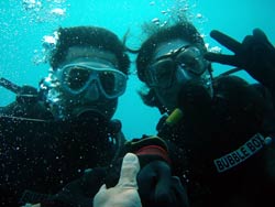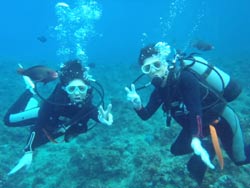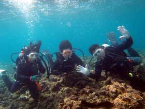 はーい!どーもーワンタンでーす!今日はビーチでファンダイビングしてきましたぁ〜!一緒に潜ってくれたのは〜サウスさん!まりちゃん!かなちゃんでーす☆★まりちゃんかなちゃんは今日でダイバーになる記念日でございます!!一本目からのんびりとニモやかわいい魚達を観察しながら〜サウスさんにも手伝ってもらいカメラをバシバシと撮っていました!!二本目はお友達の結婚式用に白クマちゃんを持っていったり(笑)。スレートでコメントを書いてみたり、色んな事をして遊びましたね!最後にはでもちゃんと実技試験をやり見事に合格!おめでとーーー!!!!これからもたくさん潜ってくださいネ―☆★待ってまーす♪♪ |