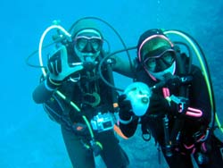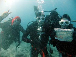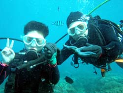 はいさ〜〜〜い、せーやです!!今日も沖縄あったかいです。そんないい天気に体験ダイビングをしに来てくれたのは、東京都お住まいのPHAMさんとTHANHさんの新婚さんのお2人☆今日はゴリラチョップの砂地でまったり泳ぎましたね!お二人ともダイビングは初体験ということでゆっくり練習しながら上手に入っていきましたよ〜〜。途中マスクに水が入ってびっくりしていましたね^^クマノミにも会ってソフトコーラルも触りました♪陸では仲良しな2人も水中ではけっこう別行動でしたねww笑)最後に2人にバブルから新婚おめでとうハンカチのプレゼントを贈りました!いつまでも仲良くお幸せに〜〜またきてくださいね☆ |