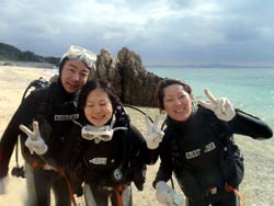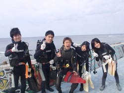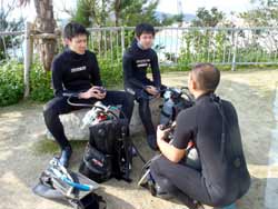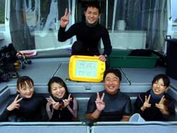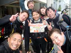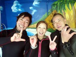 昨日地元に雪が15センチ降りました。。。寒そ。。。せーやです!!今日は滋賀県から元気な三人組みが来てくれました〜〜。なんとみんなはパチンコのバイトメンバーというのがおもしろいですね!一人はダイビング経験者で2人は初体験ダイビングで最初は気持ちも下がり気味でしたが、水中に入ったらみんな自由行動でめっちゃ泳ぎ回ってましたねー!砂地では水中散歩しましたが、海の中はやっぱり気持ちがいいですね^^お魚にエサもあげましたが、魚の寄り方がハンパじゃなかったですね。今回でめっちゃはまったんじゃないですか??今度は念願の青の洞窟に行きましょうーーー!! |