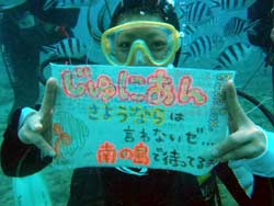 うぃす!タクです。本日はFUNダイビングです!一緒に潜ってきたのは、そろそろ?もう?沖縄生活が終了するじゅにあんとマンツーでちょっとワシャワシャしている砂辺で潜ってきました(笑)浅瀬は見事な揺れぐあいで、こいのぼりみたいになってました。じゅにあん楽しそうだった〜〜〜^0^水中もなかなか揺れてたけど、オラウータンクラブ、ツマジロオコゼ、シライトウミウシ、サザナミフグ、ハナミノカサゴなどなど・・・。なかなか見れたけど、じゅにあんは「うん・・・」みたいな感じだったね(笑)でもやっぱりお花畑はめっちゃキレイだった〜〜。んで2本目は、トモさんチーム、ワンタンさんとJACKの皆と一緒になって、じゅにあんの「さよならは言わないぜ、南の島で待ってるよお別れ会」をしました(笑)でも写真が撮れなかったので、3本目でまた集合写真を撮って・・・、そして今回は、今回こそは、じゅにあんに自分で魚とか景色の写真を撮ってもらいました(爆)ゴリチョのようにはいきませんぞ!!今日でラスト砂辺になったと思うけど、またここで笑って会おうぜ!!いつでも待ってるからなーーーー!!!!! |