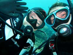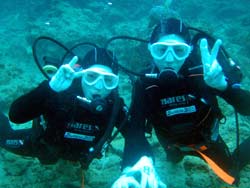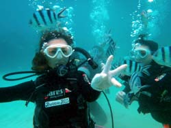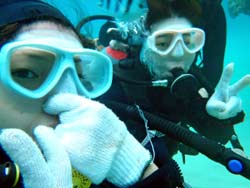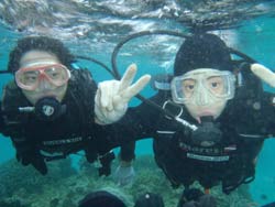 うぃす!タクです。今日も元気よく、体験ダイビングに行ってきました☆一緒に潜ってくれたのは、カオリン。砂辺と真栄田の両方でがっつり二本潜りました^0^初めてダイビングでしたが、まぁお上手(笑)ほんのちょっと・・ちょっとだけ緊張してたけど、問題なく楽しそうに泳いでいて、ちょいちょい笑わせてもらいました(笑)前回沖縄に来たときは、スノーケルで真栄田へ行って、今回が念願のダイビングで洞窟に行くこともできました!!しかも貸切状態のまま♪♪それに上手だったので、ほとんど一人で泳いでました!・・・ライセンスも余裕じゃないかな・・・(笑)でもマスククリアは一級品です!!マジです。そんなカオリンの感想ですぅ〜。 かおりん☆初めてダイビングでちょー緊張しましたが、海のキレイさと皆さんのジョーダンですぐに緊張もとけ、楽しむことができました。海サイコーです!次は体験じゃなくライセンスを取って潜りたいと思います!! |