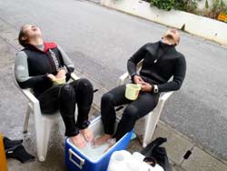 うぃす!タクです。皆さん、とりあえず右の写真をよ〜く見て下さい。俺は魚の説明を、皆は携帯に夢中・・・。そーです、自由なんです(笑)そんなFREEなメンバーは、久し振りのナッツさん&今日で二回目のお別れ会??じゅにあん&まさかの!じゅにあんと同じ職場のトモちゃん、です。一本目はじゅにあんとナッツさんで砂辺へ!カマス、グルクマの群れ、とにかく群れ!笑)透明度もよろしくて、天気も良くて、自称雨女のじゅにあんもビックリで・・。二本目からトモちゃん合流。皆で自己紹介会をしようと思ったら、トモちゃんとじゅにあんは知り合いでした、はい。そんなこんなで四人で砂辺へ。群れ、群れ、オラウータンクラブ・・・群れ!!(笑)後は・・時々じゅにあんが持ってくる、ウミウシ^0^三本目は真栄田へ。この時期は人少なくて、キレイですね!そして今日のFREEグループ隊長、じゅにあんは、とにかく自由!気がつけば上に、下に、右に、左に・・・。そんなじゅにあんとバディを組んだナッツさん、お疲れ様です(笑)そして俺の隣では、あれだけ「私、中性を取るのが苦手です」と言っていたトモちゃんが、お手本並みの中性浮力で泳いでいた事、そして褒めると、ちょっとドヤ顔になったこと、しっかりと覚えています(笑)とにかく、今日のビールは美味そうです!! |