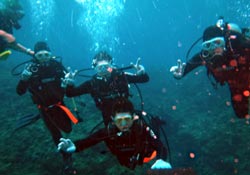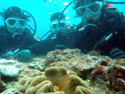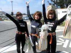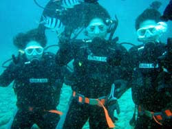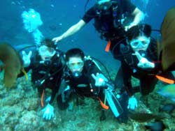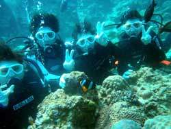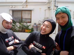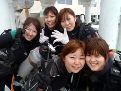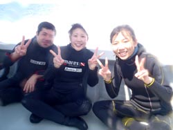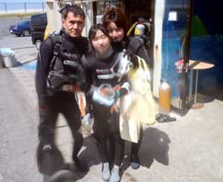 こんにちはジャックです^^♪本日2発目は大阪からお越しのカワイイ3人組!!みんなダイビングは初めてと言うことでドキドキしてましたが、練習していくと少しずつなれていって、バッチリ3人でダイビング満喫できましたね!!感想のせまーす^^☆ ちかちゃん:初めてのダイビングで不安もありましたが、インストラクターさんの解りやすい指導で私にもできました。すごく天気もよくて、海の中はすごくキレイでした!!よかった☆ありがとうございました。 まりちゃん:めっちゃキレイ!!楽しかったです☆また来まーす!!ありがとうございました☆ さおちゃん:初めてのダイビングで、ずーっと前からすっごく楽しみにしていたので、今日は天気も良くなってすっごいHAPPYでした。海の中もキレイでお魚も沢山いて、しらん間にニヤッとしてしまいましたー!^^だからゴーグルに水いっぱい入ってもうたわ〜。でも、楽しかったです☆また沖縄に来た時は、ゆうきさんよろしくお願いしまーす☆ また一緒にダイビングしようねぇ〜!!待ってます^^ |