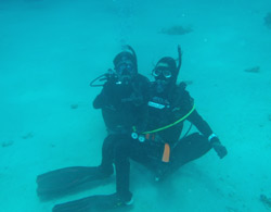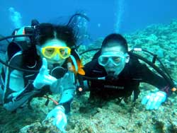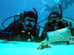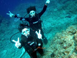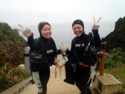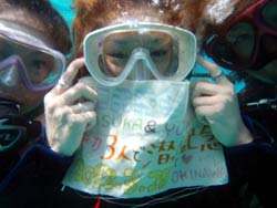 。NEWダイバー誕生の日です・・・。珍しく、トモさんが初日から最終日まで担当になった、エリちゃん&ミホちゃんの2人です♪♪初日から海に入るとは知らずに始まったOW講習・・・。マスククリアにマスク脱着、めちゃくちゃなコンパス、BCに石を入れられたり、まさかまさかのフィンを逆さ履き・・笑)数多くの珍プレーをしてくれた2人も、最終日は優雅に元気良く泳いでました!!!初日からは考えられないほど成長していました☆でもやっぱり浮いたので、石を入れました笑)でも今日でダイバーの仲間入りです!おめでとう!!これからもどんどん珍プレーを連発して上手になって(笑)、そしてダイビングをもっともっと楽しんでいってくださいね^0^また来た時は、石入れられないように!フィンも逆さまに履かないように!ちゃんと予習、復習してきてね(爆)待ってるよー☆☆ |