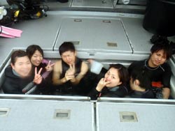 はいさ〜〜い、鼻矢印せーやです!!今日も団体わっしょいの女の子5人組みが、宮城県から来てくれました〜〜☆今回みんなダイビング初めてということでゆっくり海の方に行きましたが、怖い怖いと海に入るまで大変でしたが入ったら意外とすんなりでしたよ^^水中ではお魚にエサをあげたり、ニモに会いにも行くことができましたね♪感想もいただけました〜〜。 森さん「海に潜ったのは初めてだけど、とても楽しむ事ができてよかったです!!今度はもっと水温の高いときにきたいです^^」 橋本さん「海がきれいでとても楽しかったです^^一生の思い出です!!また来たいです。」 松本さん「初めは緊張してすごく怖かったけど、沖縄の魚達とインストラクターさんたちのおかげで楽しめました。沖縄最高ー」 鈴木さん「めっちゃ楽しかったです^^息するのが難しかったけど慣れたら海の中がキレイで感動しました!!また沖縄に来て絶対チャレンジしまーす!」 |