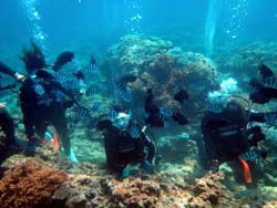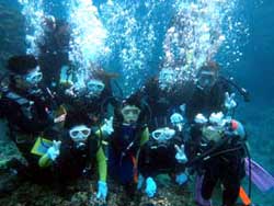 こんにちわジャック(キャプテン)です^^♪(笑)今日も行ってまいりましたぁ!大盛況の真栄田岬へ!!!本日1発目は大阪からお越しの、バイト仲間だと言う仲良し4人♪あやまん・がーしー・ごんちゃん・まろデス!!最初は、みんな緊張してました(笑)説明の時は真剣なみんなを、どうにかこうにか笑わそうと…(笑)実際海に入ってみれば、だんだん慣れてきて笑顔がみれましたぁ!!バブルリング…シュワシュワでゴメンね…もっと極めておくから、またダイビングしに来てね^^☆みんなの感想載せま〜す!! あやまん:初めは怖くて「できやん〜!!」ってお兄さんにズットしがみついてたけど、海のそこを見てると落ち着いて、だんだん出来るようになりました^^ちょーきれいで、魚もかわいくて、ニモ見た時は感動しました^^楽しかったです☆☆☆ がーしー: 最初、海に入った瞬間は「あかんわ!」って思ったけど、むっちゃ優しいお姉さんのおかげで安心して潜れました☆ほんま、ありがとうございました^^☆一生の思い出になりました。 ごんちゃん:今日は40分という短い時間でしたが、楽しい時間をありがとうございました。頼りになるキャプテンだったので安心する事ができ感謝しています。また機会があれば違うメンバーで来たいと思うで!!感動をありがとう!!お疲れ様です。 まろ:めーちゃ楽しかったです。最初は少し不安があったけど海に入ったらテンションが上がりすぎて不安とか無くなって楽しすぎました。 |