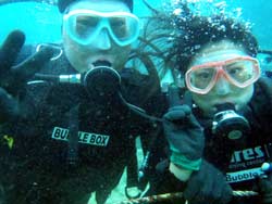 あ、こんにちは。タクです!今日の真栄田岬は最高でしたよ〜〜〜☆☆太陽キラキラ、透明度もよす〜〜でした^0^今日はバブルボックスで以前体験ダイビングに来てくれた、みっちゃん&あやちゃんのお2人です。2人とも何回も経験していて、海外でもダイビングしたこともあるぐらいで、ちょ〜〜上手でした!!ライセンス持っててもおかしくないぐらいでした♪♪餌あげるときビビッたり、黄色くて細長いヘラヤガラにケンカ売ったりして、色々笑わせてもらいました(笑)そんなお2人から感想をもらってまーす!! みっちゃん☆ヤバイ、タクちゃん最高!! あやちゃん☆やっぱり沖縄の海はキレイ!来てよかった!!また来たいです。タクちゃん楽しかった。ありがとう!! |